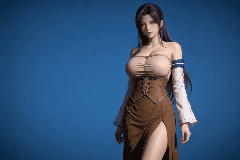 人物形象参考图2,写实风格,写真风格,真人皮肤,真人3d建模脸,超高分辨率,全身女,冷酷漠视,广角景深,高亮度,ue5渲染,强对比,电影级特效,高挑修长,日系风格,纯色蓝色背景。