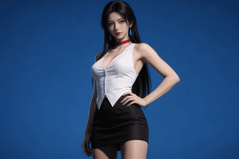 人物形象参考图2,写实风格,写真风格,真人皮肤,真人3d建模脸,超高分辨率,全身女,冷酷漠视,广角景深,高亮度,ue5渲染,强对比,电影级特效,高挑修长,日系风格,纯色蓝色背景。