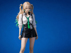 人物形象参考图2,写实风格,写真风格,真人皮肤,真人3d建模脸,超高分辨率,全身女,冷酷漠视,广角景深,高亮度,ue5渲染,强对比,电影级特效,高挑修长,日系风格,纯色蓝色背景。
