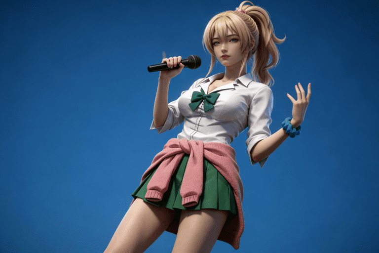 人物形象参考图2,写实风格,写真风格,真人皮肤,真人3d建模脸,超高分辨率,全身女,冷酷漠视,广角景深,高亮度,ue5渲染,强对比,电影级特效,高挑修长,日系风格,纯色蓝色背景。
