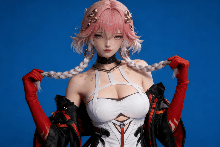 人物形象参考图2,写实风格,写真风格,真人皮肤,真人3d建模脸,超高分辨率,全身女,冷酷漠视,广角景深,高亮度,ue5渲染,强对比,电影级特效,高挑修长,日系风格,纯色蓝色背景。