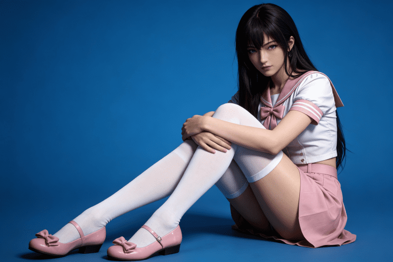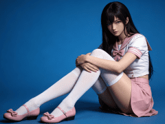 人物形象参考图2,写实风格,写真风格,真人皮肤,真人3d建模脸,超高分辨率,全身女,冷酷漠视,广角景深,高亮度,ue5渲染,强对比,电影级特效,高挑修长,日系风格,纯色蓝色背景。