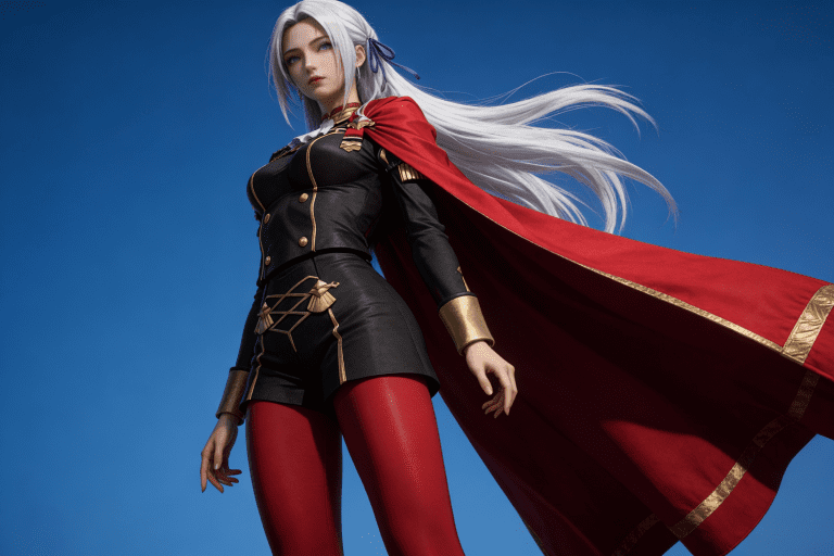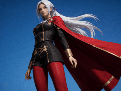 人物形象参考图2,写实风格,写真风格,真人皮肤,真人3d建模脸,超高分辨率,全身女,冷酷漠视,广角景深,高亮度,ue5渲染,强对比,电影级特效,高挑修长,日系风格,纯色蓝色背景。