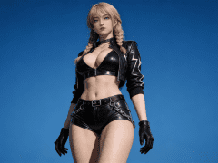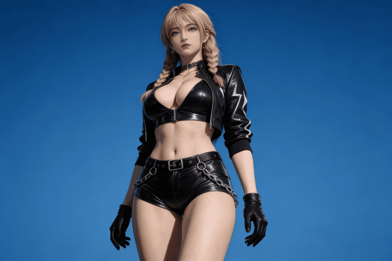 人物形象参考图2,写实风格,写真风格,真人皮肤,真人3d建模脸,超高分辨率,全身女,冷酷漠视,广角景深,高亮度,ue5渲染,强对比,电影级特效,高挑修长,日系风格,纯色蓝色背景。