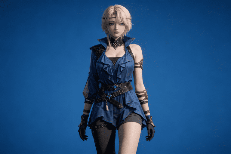 人物形象参考图2,写实风格,写真风格,真人皮肤,真人3d建模脸,超高分辨率,全身女,冷酷漠视,广角景深,高亮度,ue5渲染,强对比,电影级特效,高挑修长,日系风格,纯色蓝色背景。
