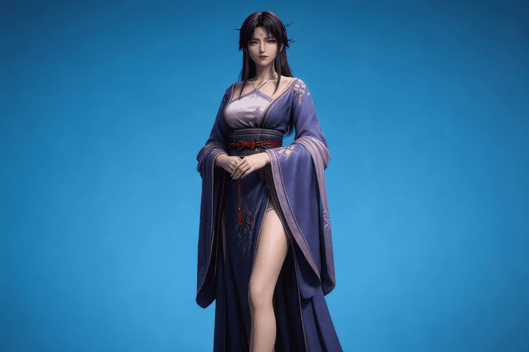 人物形象参考图2,写实风格,写真风格,真人皮肤,真人3d建模脸,超高分辨率,全身女,冷酷漠视,广角景深,高亮度,ue5渲染,强对比,电影级特效,高挑修长,日系风格,纯色蓝色背景。