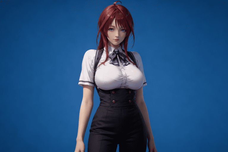人物形象参考图2,写实风格,写真风格,真人皮肤,真人3d建模脸,超高分辨率,全身女,冷酷漠视,广角景深,高亮度,ue5渲染,强对比,电影级特效,高挑修长,日系风格,纯色蓝色背景。