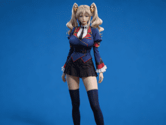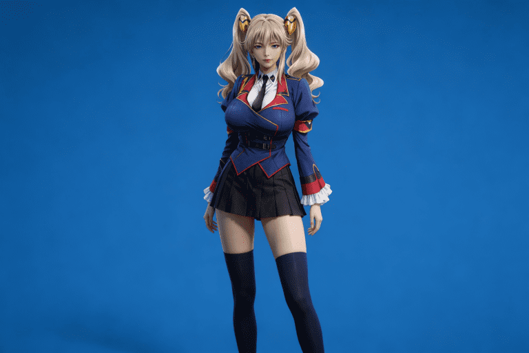 人物形象参考图2,写实风格,写真风格,真人皮肤,真人3d建模脸,超高分辨率,全身女,冷酷漠视,广角景深,高亮度,ue5渲染,强对比,电影级特效,高挑修长,日系风格,纯色蓝色背景。