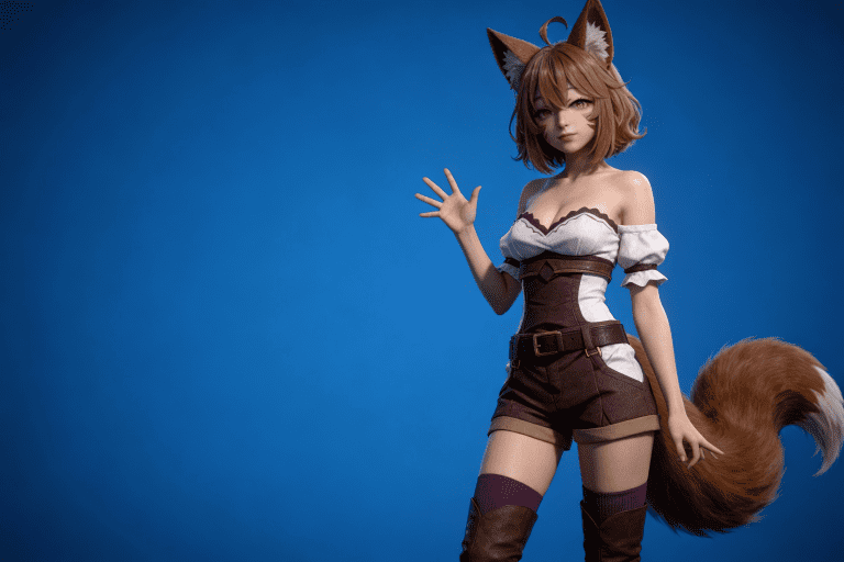 人物形象参考图,写实风格,写真风格,真人皮肤,真人3d建模脸,超高分辨率,全身女,冷酷漠视,广角景深,高亮度,ue5渲染,强对比,电影级特效,高挑修长,日系风格,纯色蓝色背景。