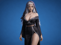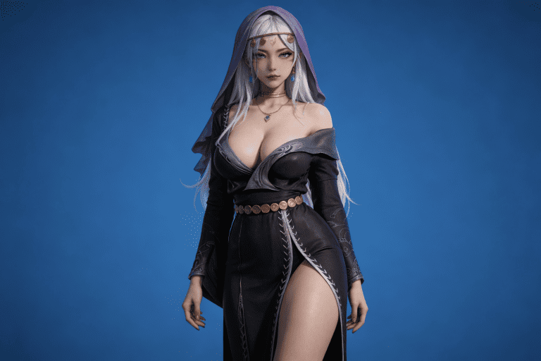 人物形象参考图2,写实风格,写真风格,真人皮肤,真人3d建模脸,超高分辨率,全身女,冷酷漠视,广角景深,高亮度,ue5渲染,强对比,电影级特效,高挑修长,日系风格,纯色蓝色背景。