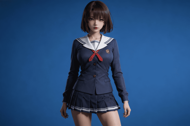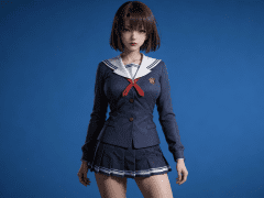 人物形象参考图2,写实风格,写真风格,真人皮肤,真人3d建模脸,超高分辨率,全身女,冷酷漠视,广角景深,高亮度,ue5渲染,强对比,电影级特效,高挑修长,日系风格,纯色蓝色背景。