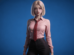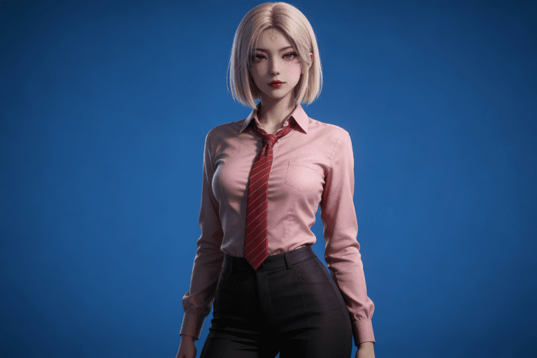人物形象参考图2,写实风格,写真风格,真人皮肤,真人3d建模脸,超高分辨率,全身女,冷酷漠视,广角景深,高亮度,ue5渲染,强对比,电影级特效,高挑修长,日系风格,纯色蓝色背景。3d动画渲染,壁纸。