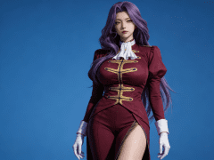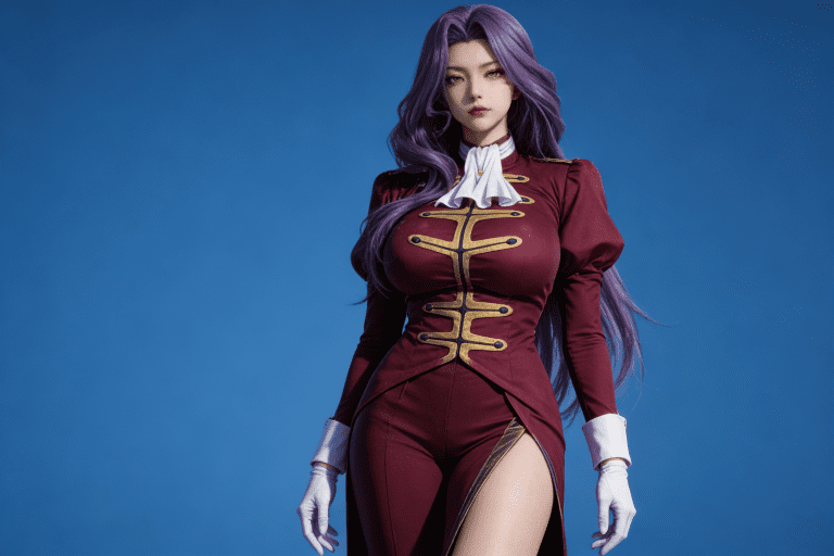 人物形象参考图2,写实风格,写真风格,真人皮肤,真人3d建模脸,超高分辨率,全身女,冷酷漠视,广角景深,高亮度,ue5渲染,强对比,电影级特效,高挑修长,日系风格,纯色蓝色背景。3d动画渲染,壁纸。