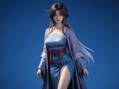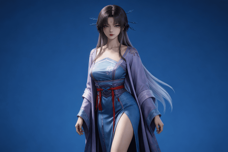 人物形象参考图2,写实风格,写真风格,真人皮肤,真人3d建模脸,超高分辨率,全身女,冷酷漠视,广角景深,高亮度,ue5渲染,强对比,电影级特效,高挑修长,日系风格,纯色蓝色背景。3d动画渲染,壁纸。