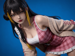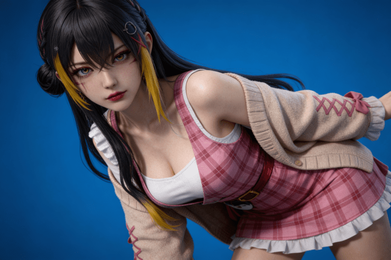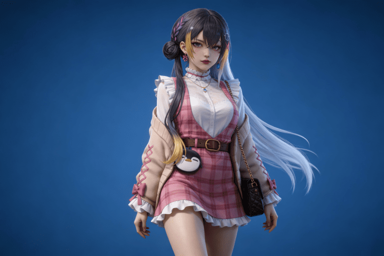 人物形象参考图2,写实风格,写真风格,真人皮肤,真人3d建模脸,超高分辨率,全身女,冷酷漠视,广角景深,高亮度,ue5渲染,强对比,电影级特效,高挑修长,日系风格,纯色蓝色背景。3d动画渲染,壁纸。