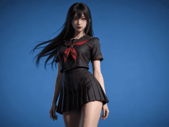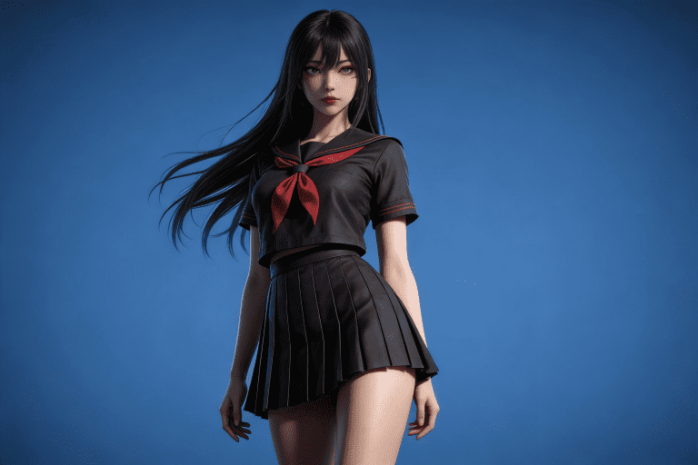人物形象参考图2,写实风格,写真风格,真人皮肤,真人3d建模脸,超高分辨率,全身女,冷酷漠视,广角景深,高亮度,ue5渲染,强对比,电影级特效,高挑修长,日系风格,纯色蓝色背景。3d动画渲染,壁纸。
