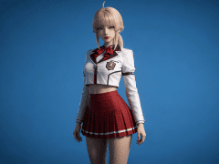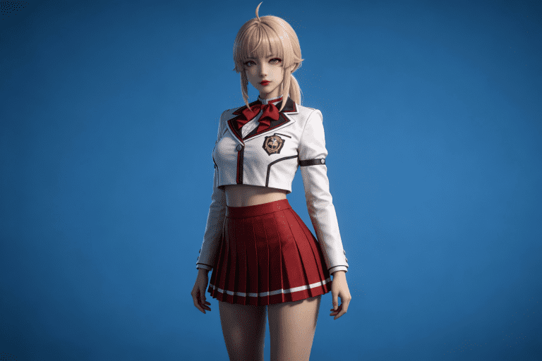 人物形象参考图2,写实风格,写真风格,真人皮肤,真人3d建模脸,超高分辨率,全身女,冷酷漠视,广角景深,高亮度,ue5渲染,强对比,电影级特效,高挑修长,日系风格,纯色蓝色背景。3d动画渲染,壁纸。