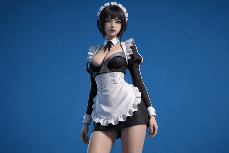 人物形象参考图2,写实风格,写真风格,真人皮肤,真人3d建模脸,超高分辨率,全身女,冷酷漠视,广角景深,高亮度,ue5渲染,强对比,电影级特效,高挑修长,日系风格,纯色蓝色背景。3d动画渲染,壁纸。