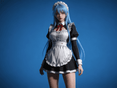 人物形象参考图2,写实风格,写真风格,真人皮肤,真人3d建模脸,超高分辨率,全身女,冷酷漠视,广角景深,高亮度,ue5渲染,强对比,电影级特效,高挑修长,日系风格,纯色蓝色背景。3d动画渲染,壁纸。