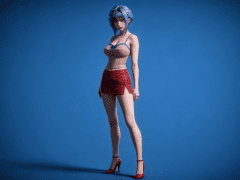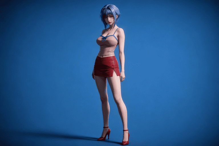 人物形象参考图2,写实风格,写真风格,真人皮肤,真人3d建模脸,超高分辨率,全身女,冷酷漠视,广角景深,高亮度,ue5渲染,强对比,电影级特效,高挑修长,日系风格,纯色蓝色背景。3d动画渲染,壁纸。
