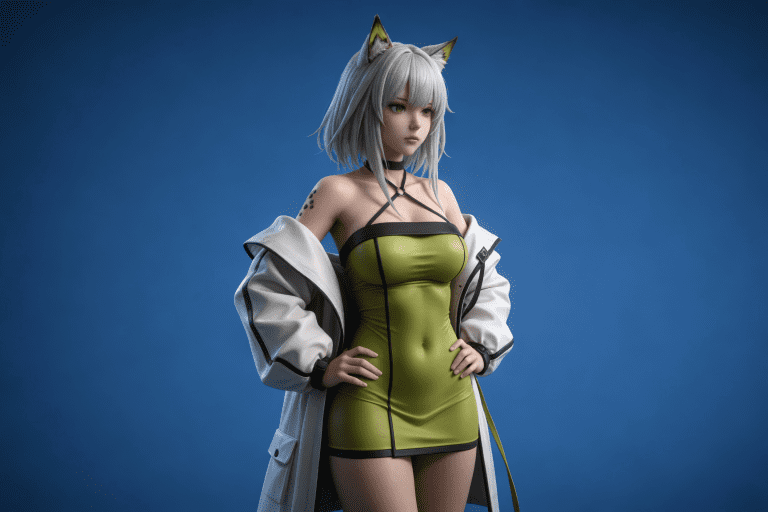 人物形象参考图2,写实风格,写真风格,真人皮肤,真人3d建模脸,超高分辨率,全身女,冷酷漠视,广角景深,高亮度,ue5渲染,强对比,电影级特效,高挑修长,日系风格,纯色蓝色背景。3d动画渲染,壁纸。