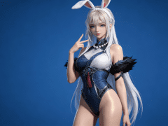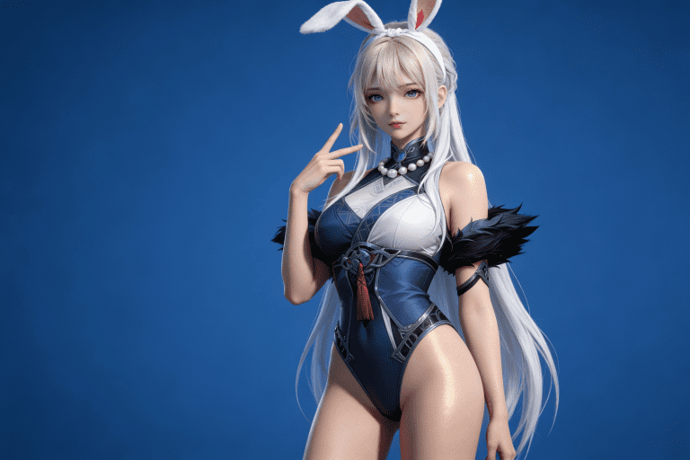 人物形象参考图2,写实风格,写真风格,真人皮肤,皮肤金莹透白,美白滤镜,真人3d建模脸,超高分辨率,全身女,冷酷漠视,广角景深,高亮度,ue5建模,强对比,电影级特效,高挑修长,日系风格,纯色蓝色背景。3d动画渲染,壁纸。