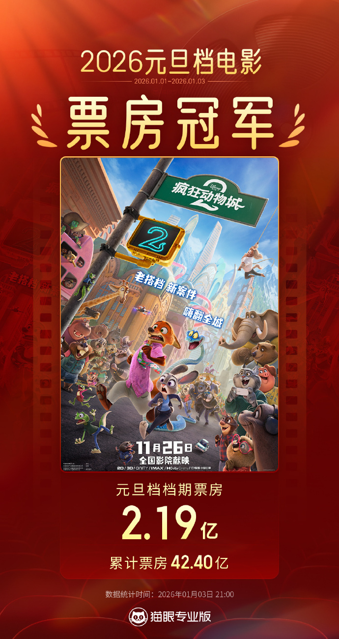 据猫眼专业版数据显示,截至1月3日21时,2026年元旦档总票房已达7.34亿元,《疯狂动物城2》以2.19亿元的优异成绩稳居档期票房冠军宝座。这部迪士尼动画续作不仅在假期三天内斩获超2亿票房,其累计总票房更是突破42.40亿元大关,即将超越《冰雪奇缘2》登顶中国影史进口片票房榜。
