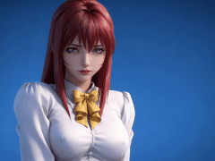 人物形象参考图2,写实风格,写真风格,真人皮肤,美白滤镜,真人3d建模脸,超高分辨率,全身女,冷酷漠视,广角景深,高亮度,ue5建模,强对比,电影级特效,高挑修长,日系风格,纯色蓝色背景。3d动画渲染,壁纸。