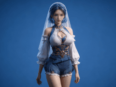 人物形象参考图2,写实风格,写真风格,真人皮肤,美白滤镜,真人3d建模脸,超高分辨率,全身女,冷酷漠视,广角景深,高亮度,ue5建模,强对比,电影级特效,高挑修长,日系风格,纯色蓝色背景。3d动画渲染,壁纸。