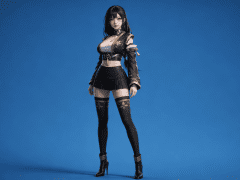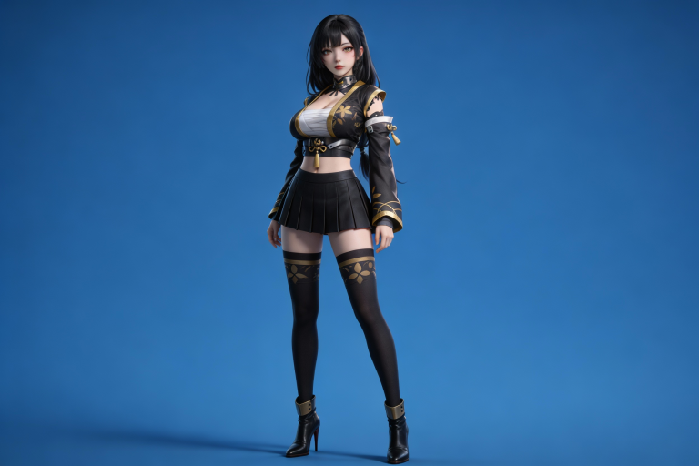 人物形象参考图2,写实风格,写真风格,真人皮肤,美白滤镜,真人3d建模脸,超高分辨率,全身女,冷酷漠视,广角景深,高亮度,ue5建模,强对比,电影级特效,高挑修长,日系风格,纯色蓝色背景。3d动画渲染,壁纸。