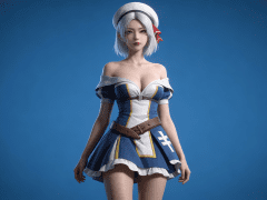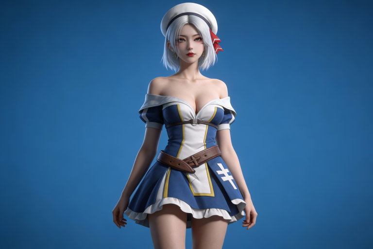 人物形象参考图2,写实风格,写真风格,建模3d皮肤,美白滤镜,真人3d建模脸,超高分辨率,全身女,冷酷漠视,广角景深,高亮度,立体光,ue5建模,强对比,电影级特效,高挑修长,日系风格,纯色蓝色背景。3d动画渲染,壁纸。