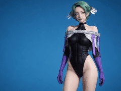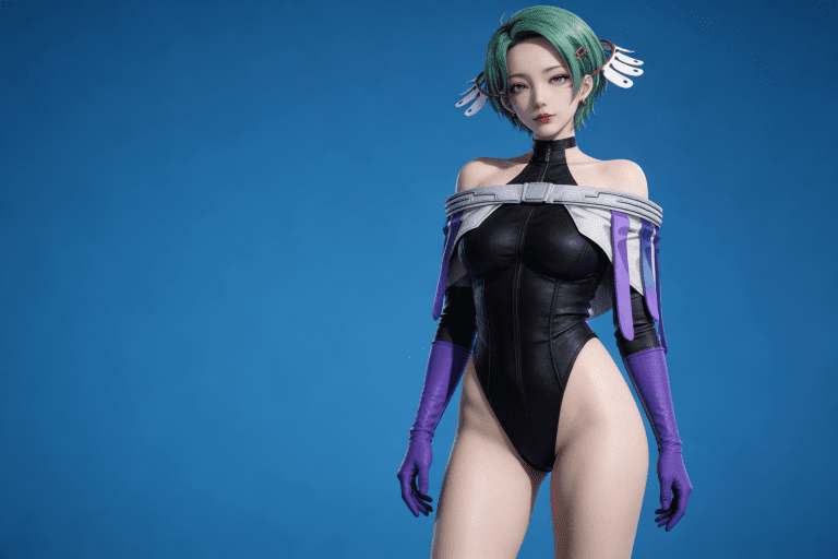 人物形象参考图2,写实风格,写真风格,建模3d皮肤,白嫩皮肤,美白滤镜,真人3d建模脸,超高分辨率,全身女,冷酷漠视,广角景深,高亮度,立体光,ue5建模,强对比,电影级特效,高挑修长,日系风格,纯色蓝色背景。3d动画渲染,壁纸。