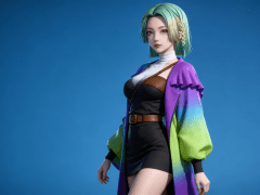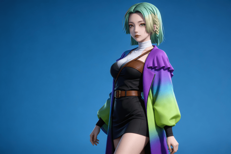 人物形象参考图2,写实风格,写真风格,建模3d皮肤,白嫩皮肤,美白滤镜,真人3d建模脸,超高分辨率,全身女,冷酷漠视,广角景深,高亮度,立体光,ue5建模,强对比,电影级特效,高挑修长,日系风格,纯色蓝色背景。3d动画渲染,壁纸。