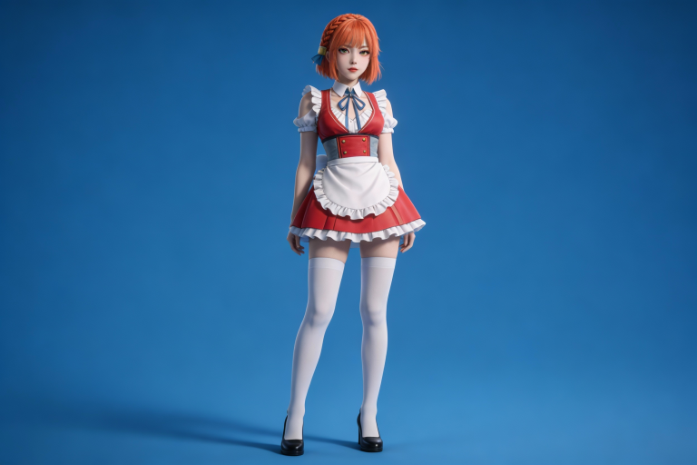 人物形象参考图2,写实风格,写真风格,建模3d皮肤,白嫩皮肤,美白滤镜,真人3d建模脸,超高分辨率,全身女,冷酷漠视,广角景深,高亮度,立体光,ue5建模,强对比,电影级特效,高挑修长,日系风格,纯色蓝色背景。3d动画渲染,壁纸。