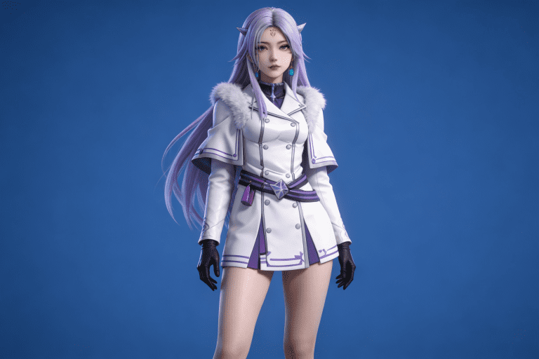人物形象参考图2,写实风格,写真风格,建模3d皮肤,白嫩皮肤,美白滤镜,真人3d建模脸,超高分辨率,全身女,冷酷漠视,广角景深,高亮度,立体光,ue5建模,强对比,电影级特效,高挑修长,日系风格,纯色蓝色背景。3d动画渲染,壁纸。