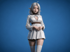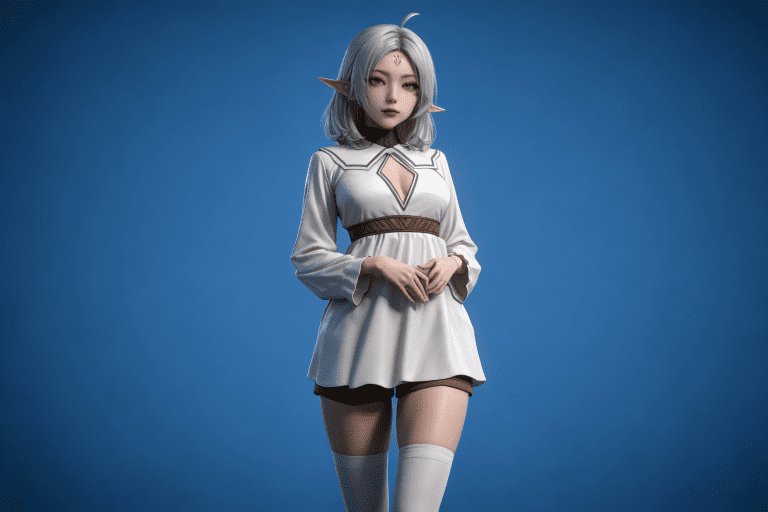人物形象参考图2,写实风格,写真风格,建模3d皮肤,白嫩皮肤,美白滤镜,真人3d建模脸,超高分辨率,全身女,冷酷漠视,广角景深,高亮度,立体光,ue5建模,强对比,电影级特效,高挑修长,日系风格,纯色蓝色背景。3d动画渲染,壁纸。