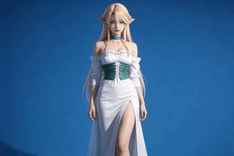 人物形象参考图2,写实风格,写真风格,建模3d皮肤,白嫩皮肤,美白滤镜,真人3d建模脸,超高分辨率,全身女,冷酷漠视,广角景深,高亮度,立体光,ue5建模,强对比,电影级特效,高挑修长,日系风格,纯色蓝色背景。3d动画渲染,壁纸。