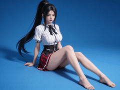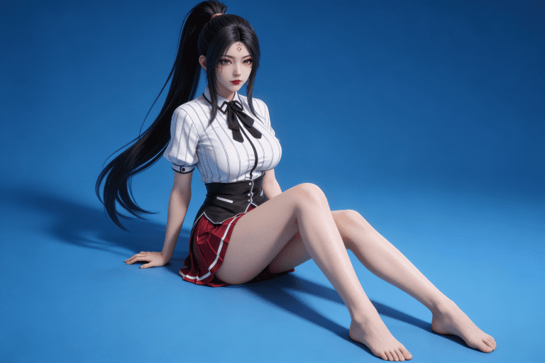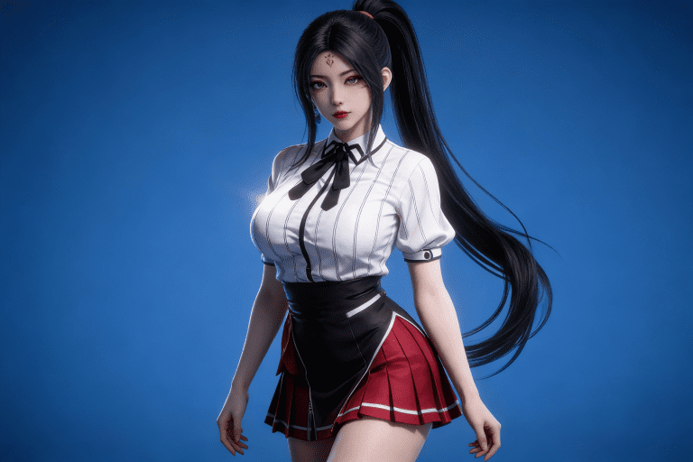 人物形象参考图2,写实风格,写真风格,建模3d皮肤,白嫩皮肤,美白滤镜,真人3d建模脸,超高分辨率,全身女,冷酷漠视,广角景深,高亮度,立体光,ue5建模,强对比,电影级特效,高挑修长,日系风格,纯色蓝色背景。3d动画渲染,壁纸。散射光,景深。