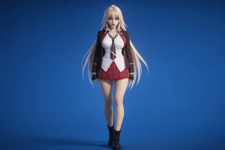 人物形象参考图2,写实风格,写真风格,建模3d皮肤,白嫩皮肤,美白滤镜,真人3d建模脸,超高分辨率,全身女,冷酷漠视,广角景深,高亮度,立体光,ue5建模,强对比,电影级特效,高挑修长,日系风格,纯色蓝色背景。3d动画渲染,壁纸。散射光,景深。