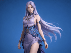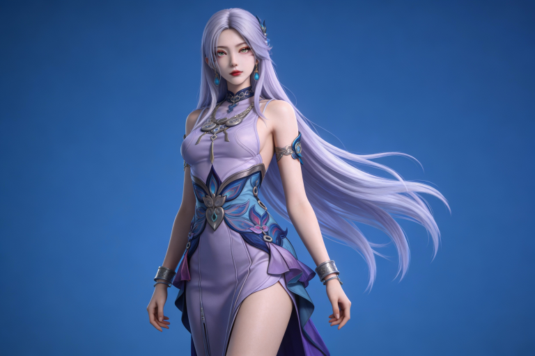 人物形象参考图2,写实风格,写真风格,建模3d皮肤,白嫩皮肤,美白滤镜,真人3d建模脸,超高分辨率,全身女,冷酷漠视,广角景深,高亮度,立体光,ue5建模,强对比,电影级特效,高挑修长,日系风格,纯色蓝色背景。3d动画渲染,壁纸。散射光,景深。
