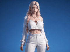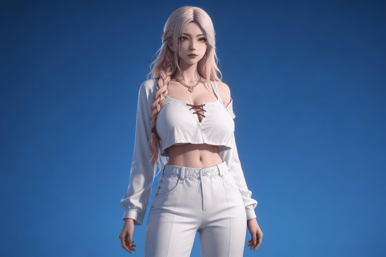人物形象参考图2,写实风格,写真风格,建模3d皮肤,白嫩皮肤,美白滤镜,真人3d建模脸,超高分辨率,全身女,冷酷漠视,广角景深,高亮度,立体光,ue5建模,强对比,电影级特效,高挑修长,日系风格,纯色蓝色背景。3d动画渲染,壁纸。散射光,景深。