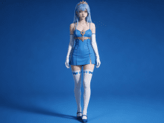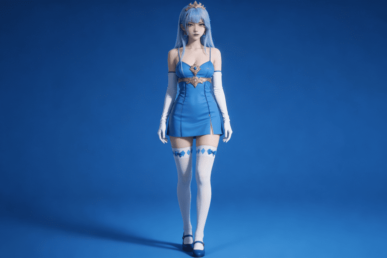 人物形象参考图2,写实风格,写真风格,建模3d皮肤,白嫩皮肤,美白滤镜,真人3d建模脸,超高分辨率,全身女,冷酷漠视,广角景深,高亮度,立体光,ue5建模,强对比,电影级特效,高挑修长,日系风格,纯色蓝色背景。3d动画渲染,壁纸。散射光,景深。