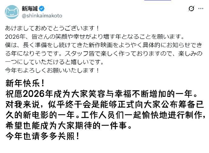 2026年的第一缕阳光刚刚洒向大地,日本动画大师新海诚便向全球影迷送上了一份特别的新年礼物——他在社交媒体上郑重宣布,那部筹备已久的全新动画电影,终于将在今年揭开神秘面纱。”希望2026年是让大家拥有更多笑容和幸福的一年。我长期以来持续准备的新作电影,似乎终于能在今年向大家具体公布了。因为我们全体工作人员都正愉快地制作着,如果它能成为大家期待的事物之一,我会非常高兴。”这番饱含期待的话语,瞬间点燃了影迷们心中沉寂已久的热望。