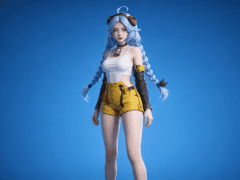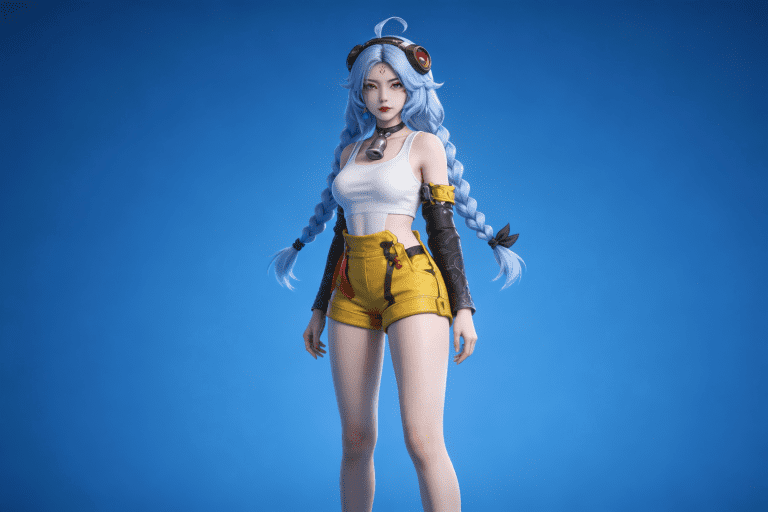 人物形象参考图2,写实风格,写真风格,建模3d皮肤,白嫩皮肤,美白滤镜,真人3d建模脸,超高分辨率,全身女,冷酷漠视,广角景深,高亮度,立体光,ue5建模,强对比,电影级特效,高挑修长,日系风格,纯色蓝色背景。3d动画渲染,壁纸。散射光,景深。