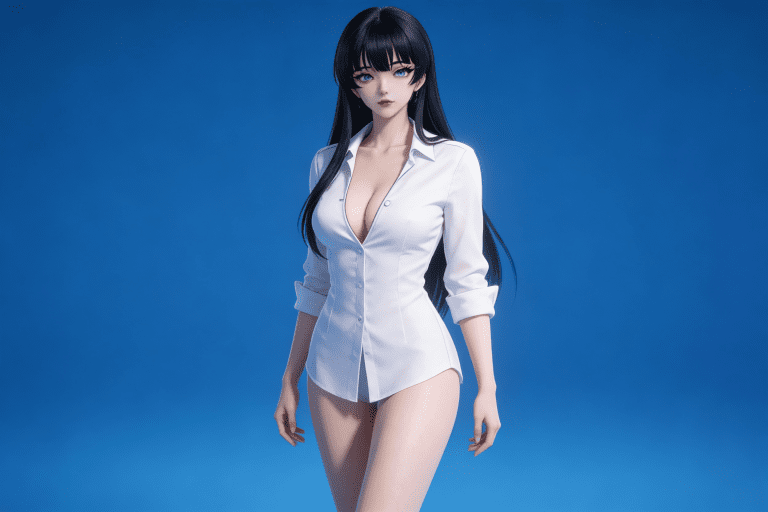 人物形象参考图2,写实风格,写真风格,建模3d皮肤,白嫩皮肤,美白滤镜,真人3d建模脸,超高分辨率,全身女,冷酷漠视,广角景深,高亮度,立体光,ue5建模,强对比,电影级特效,高挑修长,日系风格,纯色蓝色背景。3d动画渲染,壁纸。散射光,景深。