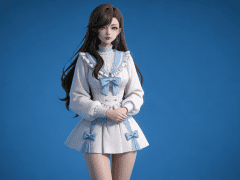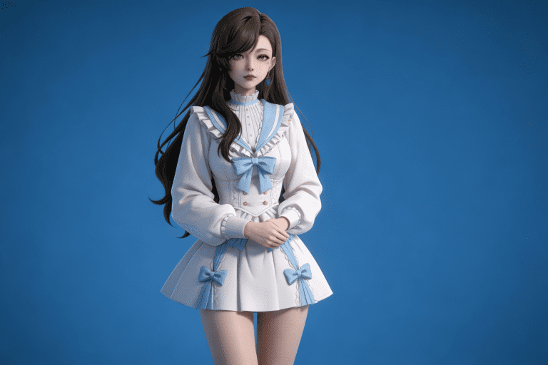 人物形象参考图2,写实风格,写真风格,建模3d皮肤,白嫩皮肤,美白滤镜,真人3d建模脸,超高分辨率,全身女,冷酷漠视,广角景深,高亮度,立体光,ue5建模,强对比,电影级特效,高挑修长,日系风格,纯色蓝色背景。3d动画渲染,壁纸。散射光,景深。