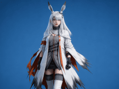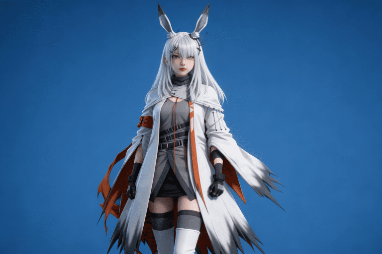 人物形象参考图2,写实风格,写真风格,建模3d皮肤,白嫩皮肤,美白滤镜,真人3d建模脸,超高分辨率,全身女,冷酷漠视,广角景深,高亮度,立体光,ue5建模,强对比,电影级特效,高挑修长,日系风格,纯色蓝色背景。3d动画渲染,壁纸。散射光,景深。