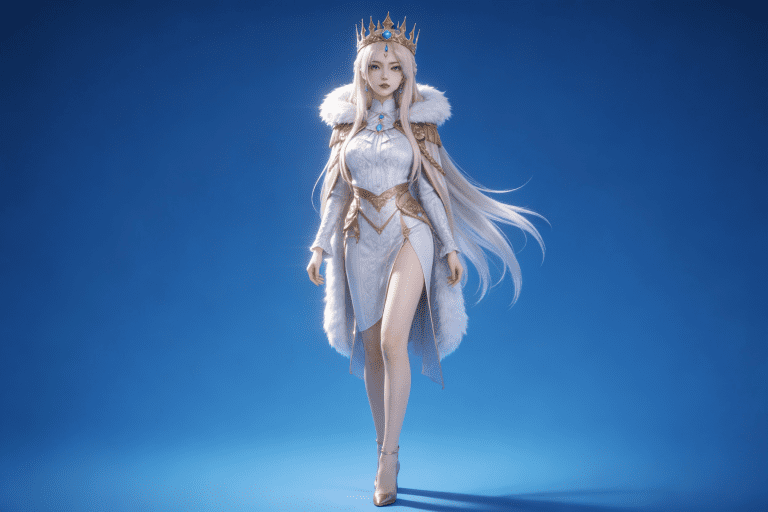 人物形象参考图2,写实风格,写真风格,建模3d皮肤,白嫩皮肤,美白滤镜,真人3d建模脸,超高分辨率,全身女,冷酷漠视,广角景深,高亮度,立体光,ue5建模,强对比,电影级特效,高挑修长,日系风格,纯色蓝色背景。3d动画渲染,壁纸。散射光,景深。