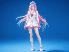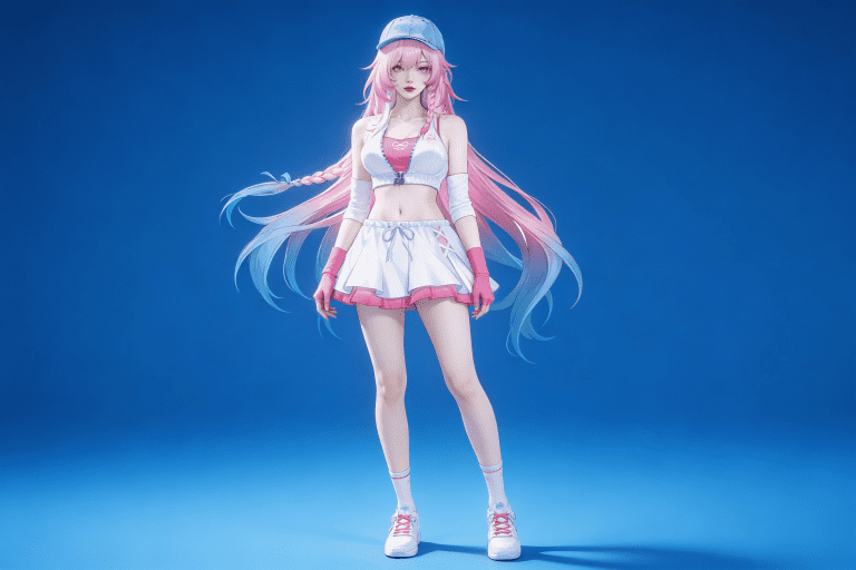 人物形象参考图2,写实风格,写真风格,建模3d皮肤,白嫩皮肤,美白滤镜,真人3d建模脸,超高分辨率,全身女,冷酷漠视,广角景深,高亮度,立体光,ue5建模,强对比,电影级特效,高挑修长,日系风格,纯色蓝色背景。3d动画渲染,壁纸。散射光,景深。