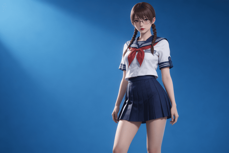 人物形象参考图2,写实风格,写真风格,建模3d皮肤,白嫩皮肤,美白滤镜,真人3d建模脸,超高分辨率,全身女,冷酷漠视,广角景深,高亮度,立体光,ue5建模,强对比,电影级特效,高挑修长,日系风格,纯色蓝色背景。3d动画渲染,壁纸。散射光,景深。